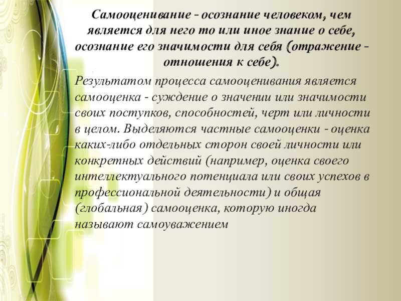 Слайд 6Самооценивание - осознание человеком, чем является для него то или иное