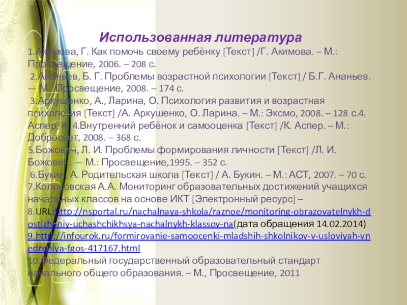 3.Аркушенко, А., Ларина, О. Психология развития и возрастная психология [Текст] /А. Аркушенко, О. Ларина. – М.: Эксмо, 2008. – 128 с.4. Аспер, К. 4.Внутренний ребёнок и самооценка [Текст] /К. Аспер. – М.: Добросвет, 2008. – 368 с.
