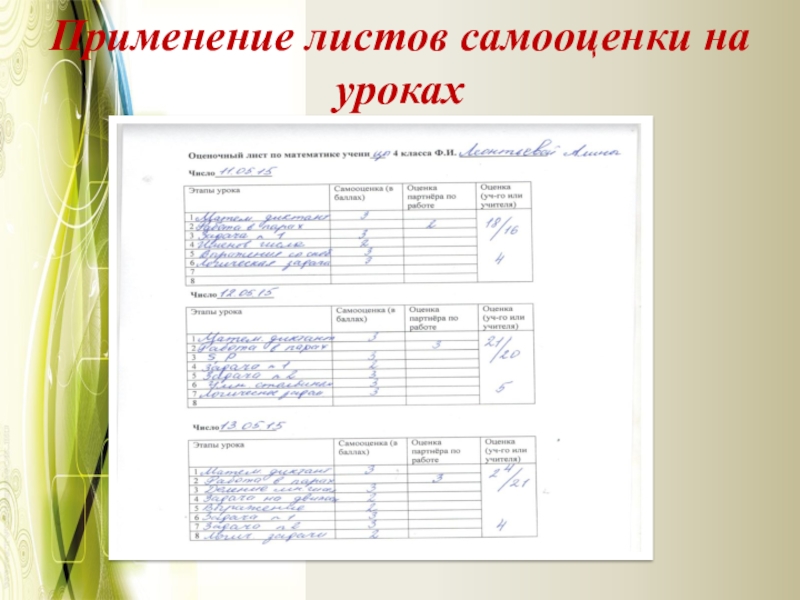 Слайд 19Применение листов самооценки на уроках