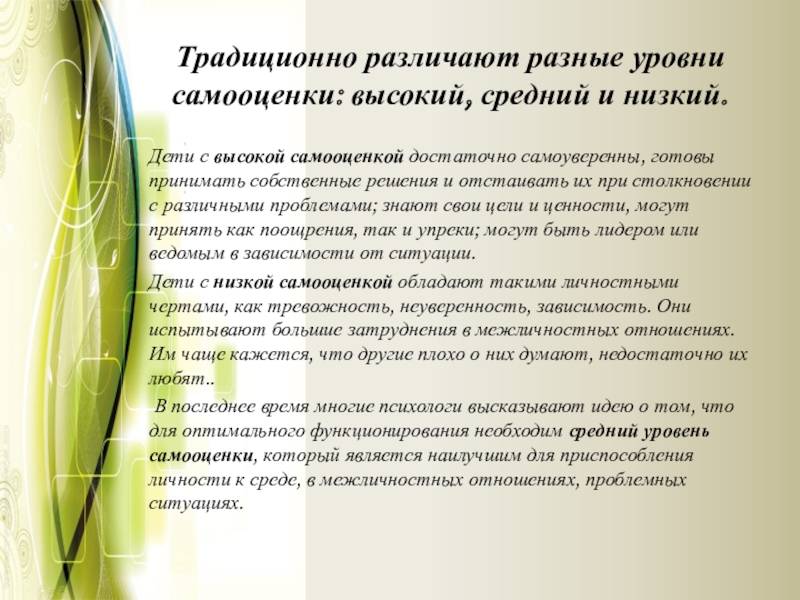 Слайд 7Традиционно различают разные уровни самооценки: высокий, средний и низкий.