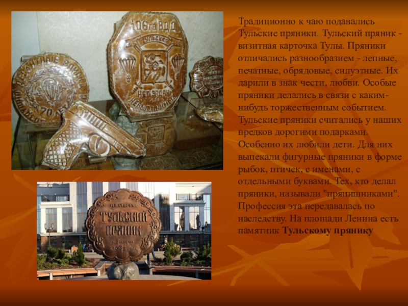Слайд 8Традиционно к чаю подавались Тульские пряники. Тульский пряник - визитная карточка