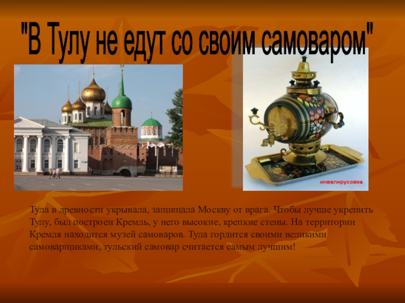 укрывала, защищала Москву от врага. Чтобы лучше укрепить Тулу, был построен Кремль, у него высокие, крепкие стены. На территории Кремля находится музей самоваров. Тула гордится своими великими самоварщиками, тульский самовар считается самым лучшим!