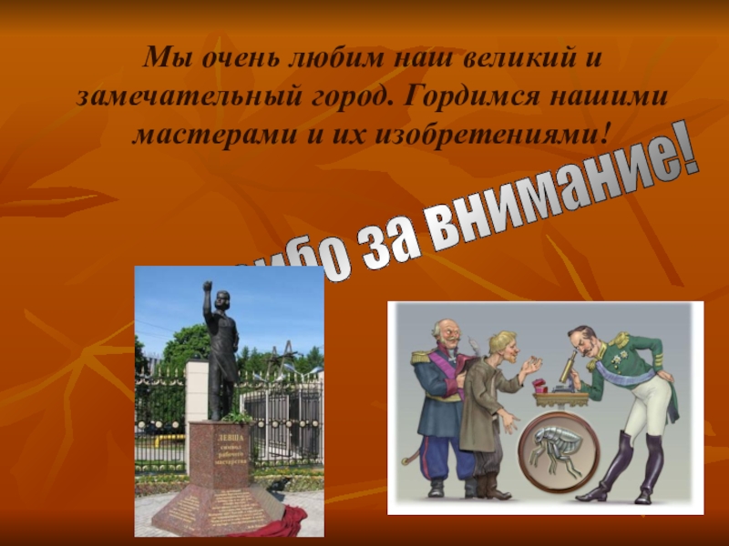 Мы очень любим наш великий и замечательный город. Гордимся нашими мастерами и их изобретениями!Спасибо за внимание!