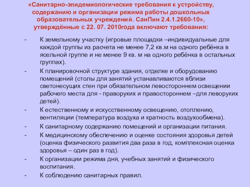 «Санитарно-эпидемиологические требования к устройству, содержанию и организации режима работы дошкольных образовательных учреждений. СанПин 2.4.1.2660-10», утверждённые с 22. 07. 2010года включают требования: