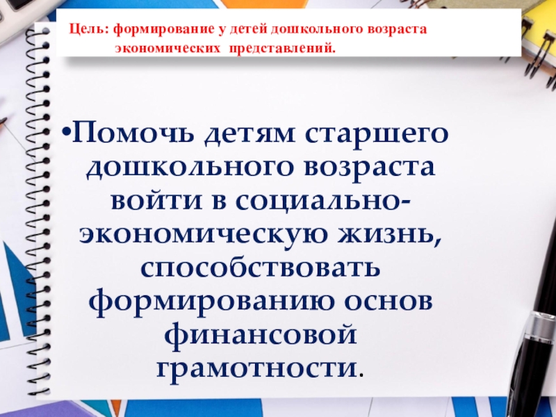 Помочь детям старшего дошкольного возраста войти в социально-экономическую жизнь, способствовать формированию основ финансовой грамотности.