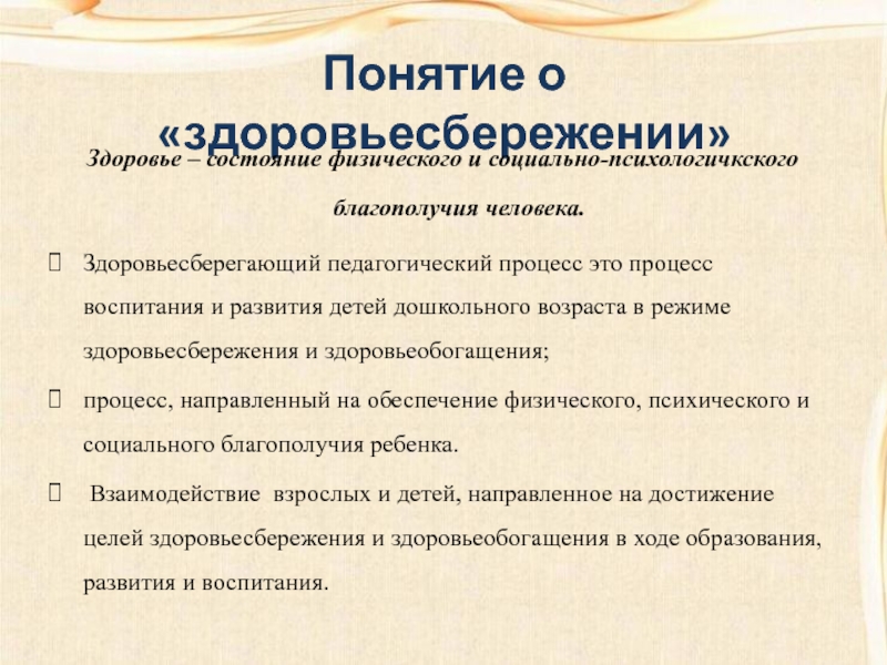 Понятие о «здоровьесбережении»Здоровье – состояние физического и социально-психологичкского благополучия человека.Здоровьесберегающий педагогический процесс это процесс воспитания и развития