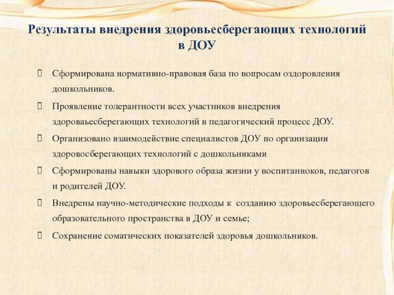 Результаты внедрения здоровьесберегающих технологий в ДОУСформирована нормативно-правовая база по вопросам оздоровления дошкольников.Проявление толерантности всех участников внедрения здороваьесберегающих