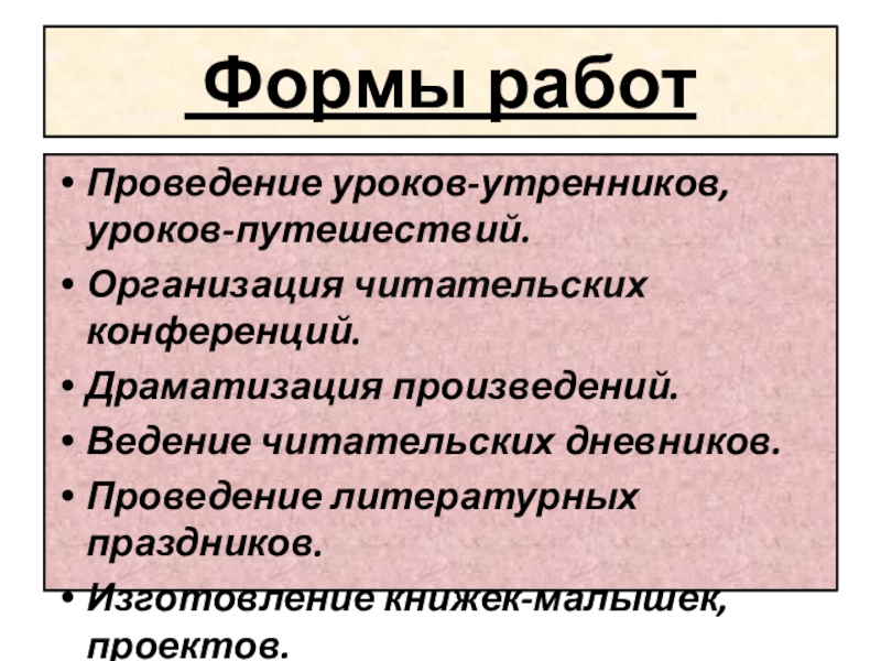 Формы работПроведение уроков-утренников, уроков-путешествий.Организация читательских конференций.Драматизация произведений.Ведение читательских дневников.Проведение литературных праздников.Изготовление книжек-малышек, проектов.