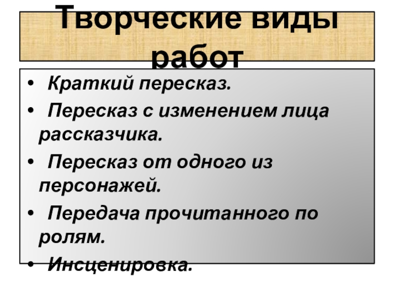 Творческие виды работ Краткий пересказ. Пересказ с изменением лица рассказчика. Пересказ от одного из персонажей. Передача прочитанного