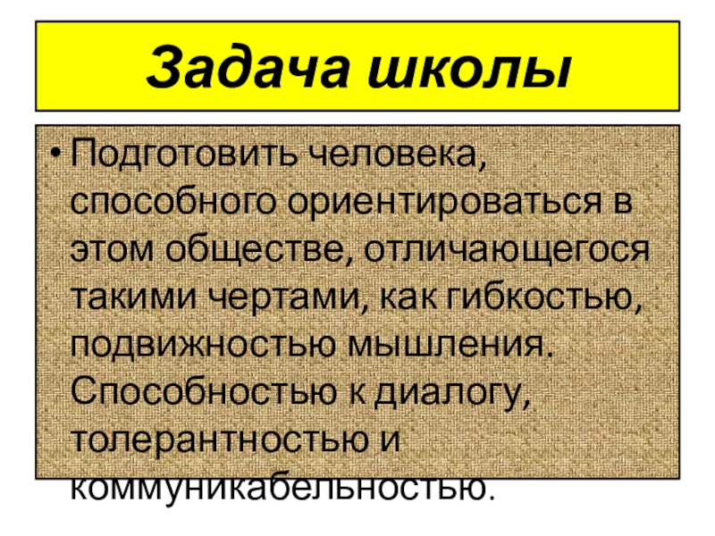 Задача школыПодготовить человека, способного ориентироваться в этом обществе, отличающегося такими чертами, как гибкостью, подвижностью мышления. Способностью к диалогу, толерантностью и коммуникабельностью.