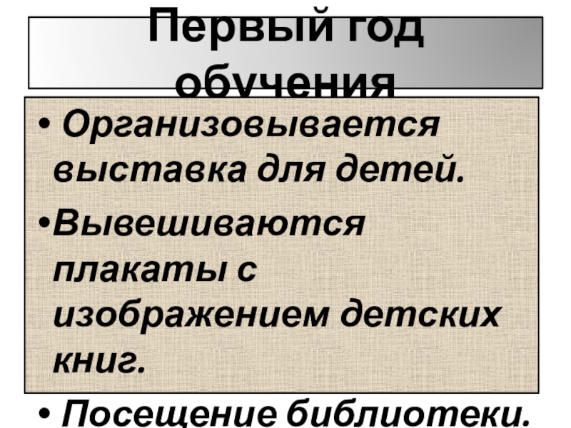 Первый год обучения Организовывается выставка для детей.Вывешиваются плакаты с изображением детских книг. Посещение библиотеки.