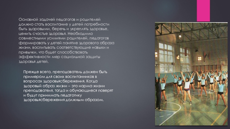 Прежде всего, преподаватель должен быть примером для своих воспитанников в вопросах здоровьясбережения. Когда здоровый образ жизни – это норма жизни преподавателя, тогда и обучающиеся поверят и будут принимать педагогику здоровьясбережения должным образом.