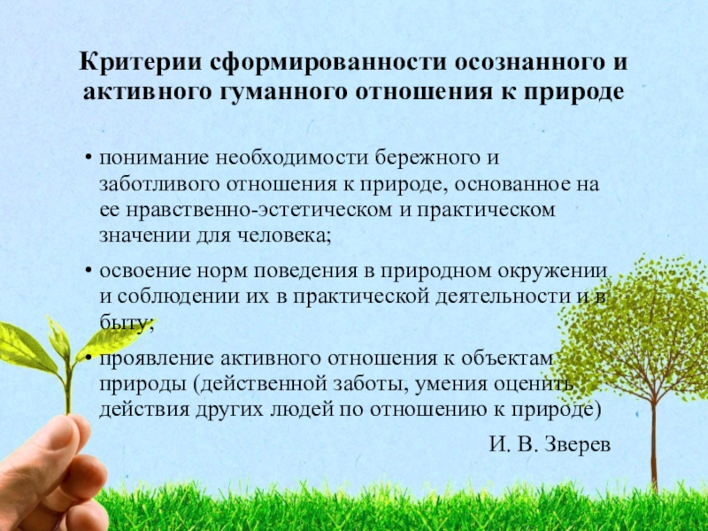Слайд 8Критерии сформированности осознанного и активного гуманного отношения к природе
