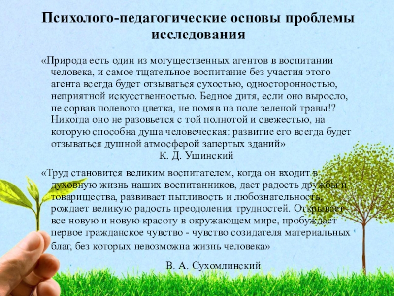 человека, и самое тщательное воспитание без участия этого агента всегда будет отзываться сухостью, односторонностью, неприятной искусственностью. Бедное дитя, если оно выросло, не сорвав полевого цветка, не помяв на поле зеленой травы!? Никогда оно не разовьется с той полнотой и свежестью, на которую способна душа человеческая: развитие его всегда будет отзываться душной атмосферой запертых зданий» К. Д. Ушинский