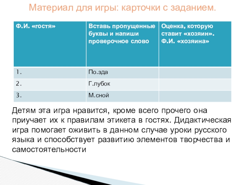 Детям эта игра нравится, кроме всего прочего она приучает их к правилам этикета в гостях. Дидактическая игра помогает оживить в данном случае уроки русского языка и способствует развитию элементов творчества и самостоятельности
