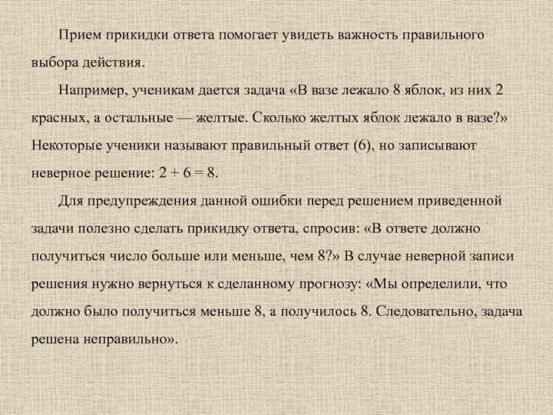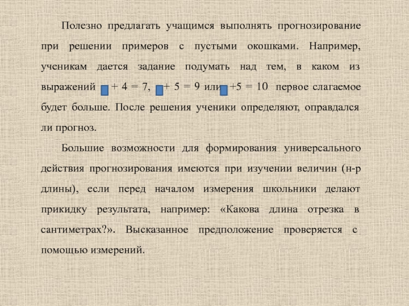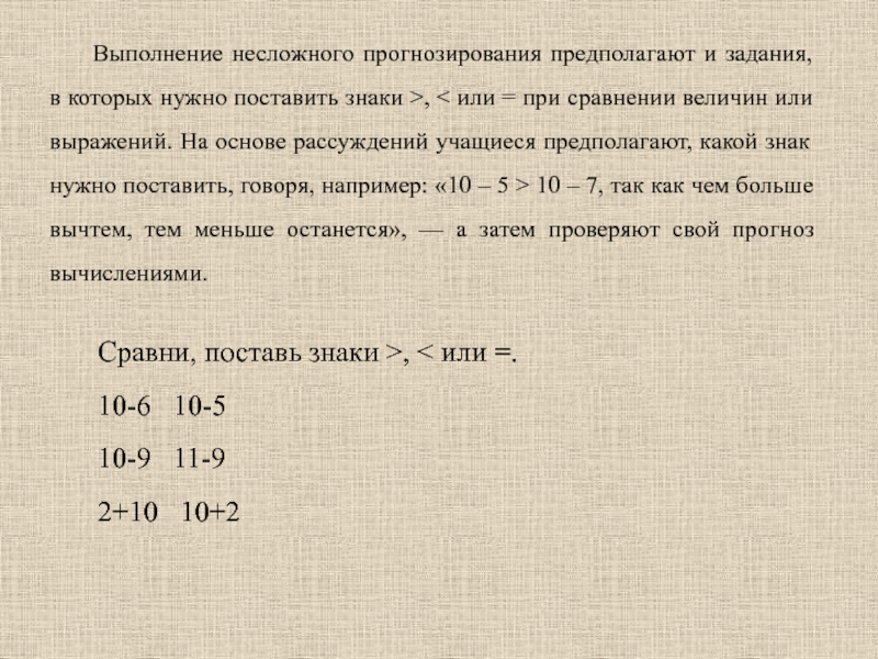 Выполнение несложного прогнозирования предполагают и задания, в которых нужно поставить знаки >, < или = при сравнении величин или выражений. На основе рассуждений учащиеся предполагают, какой знак нужно поставить, говоря, например: «10 – 5 > 10 – 7, так как чем больше вычтем, тем меньше останется», — а затем проверяют свой прогноз вычислениями.