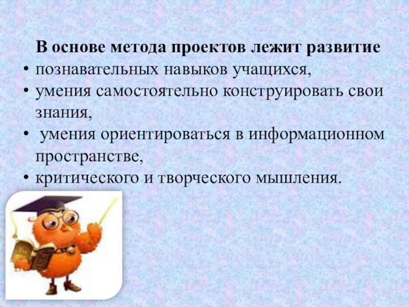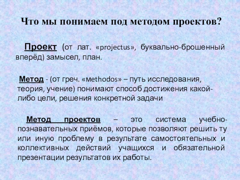 Метод проектов – это система учебно-познавательных приёмов, которые позволяют решить ту или иную проблему в результате самостоятельных и коллективных действий учащихся и обязательной презентации результатов их работы.