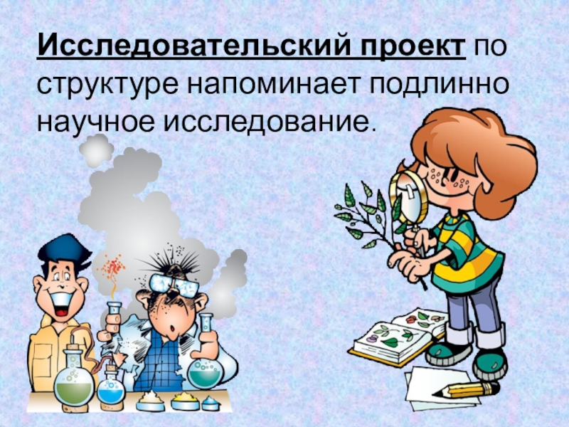 Слайд 9Исследовательский проект по структуре напоминает подлинно научное исследование.