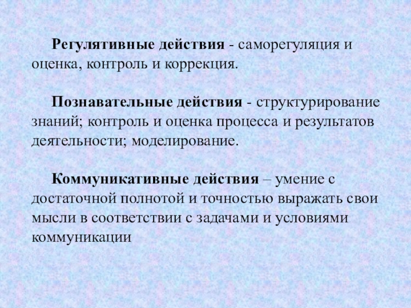 Слайд 29Регулятивные действия - саморегуляция и оценка, контроль и коррекция.