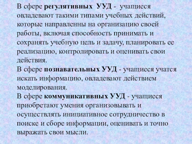 Слайд 25В сфере регулятивных УУД - учащиеся овладевают такими типами учебных действий,