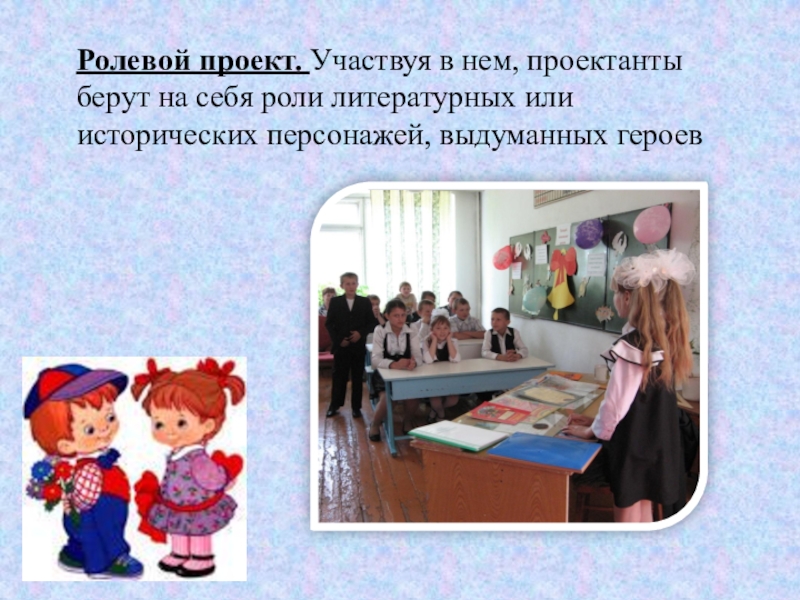 Слайд 14Ролевой проект. Участвуя в нем, проектанты берут на себя роли литературных