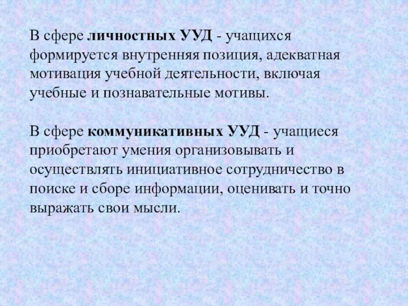 Слайд 23В сфере личностных УУД - учащихся формируется внутренняя позиция, адекватная мотивация