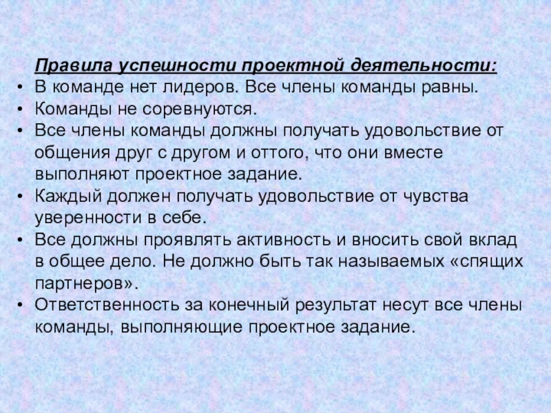 Все члены команды должны получать удовольствие от общения друг с другом и оттого, что они вместе выполняют проектное задание.