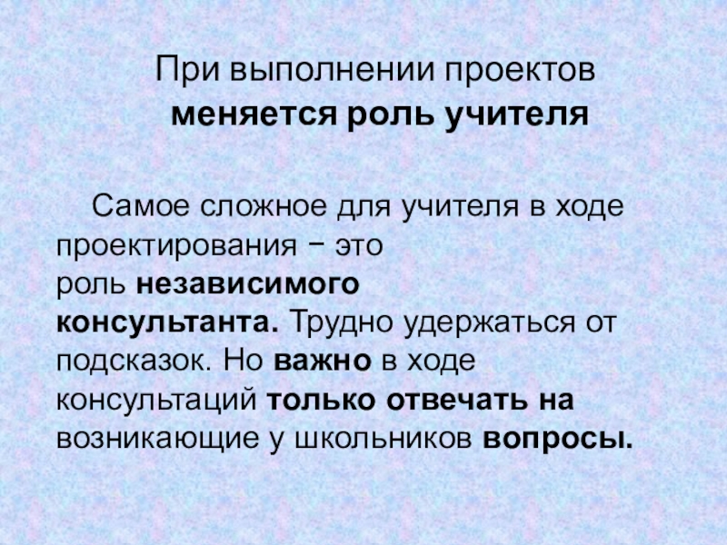 проектирования − это роль независимого консультанта. Трудно удержаться от подсказок. Но важно в ходе консультаций только отвечать на возникающие у школьников вопросы.