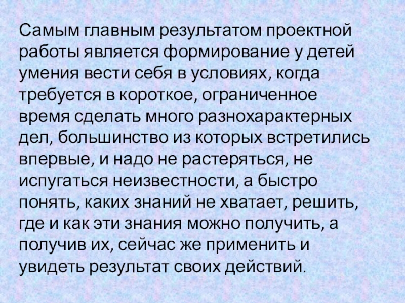 Слайд 33Самым главным результатом проектной работы является формирование у детей умения вести