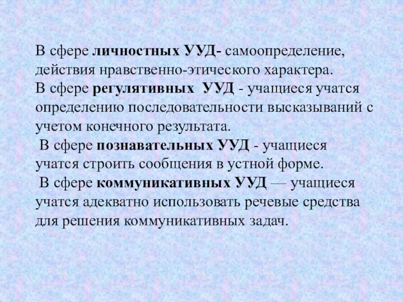 В сфере личностных УУД- самоопределение, действия нравственно-этического характера.