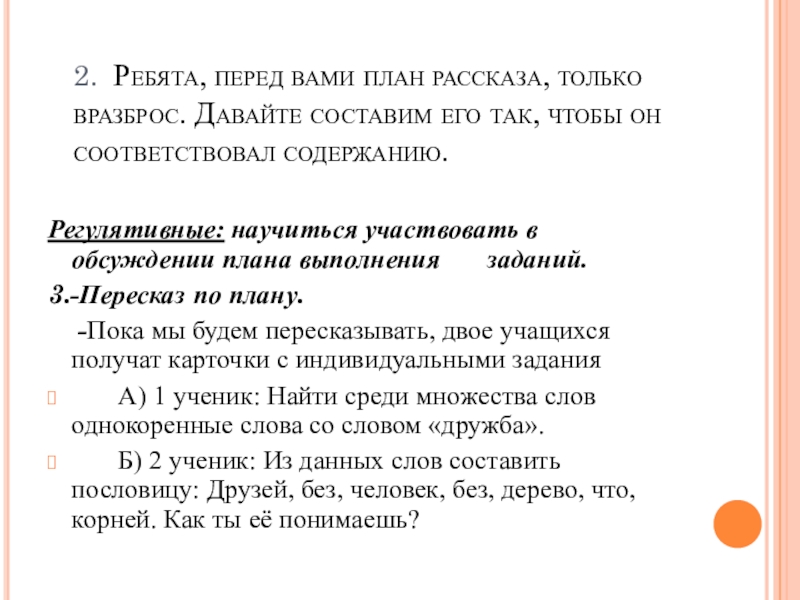 А) 1 ученик: Найти среди множества слов однокоренные слова со словом «дружба».