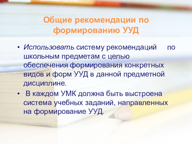 Общие рекомендации по формированию УУДИспользовать систему рекомендаций   по школьным предметам с целью обеспечения формирования конкретных