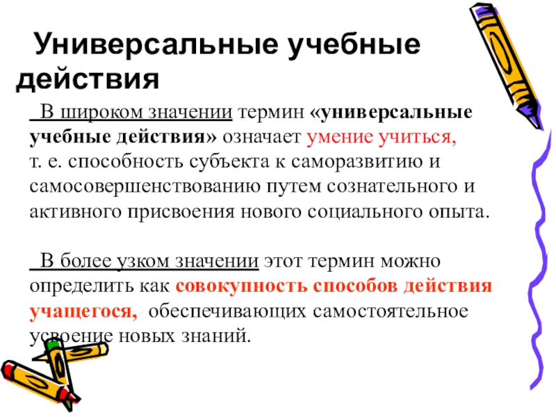 Универсальные учебные действия В широком значении термин «универсальные учебные действия» означает умение учиться, т. е. способность субъекта к саморазвитию и самосовершенствованию путем сознательного и активного присвоения нового социального опыта. В более узком значении этот термин