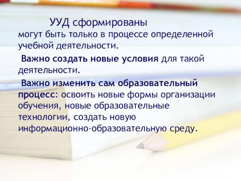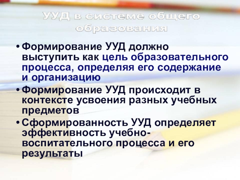 Формирование УУД должно выступить как цель образовательного процесса, определяя его содержание и организациюФормирование УУД происходит в контексте