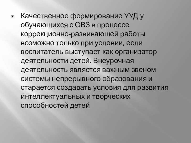 Слайд 16Качественное формирование УУД у обучающихся с ОВЗ в процессе коррекционно-развивающей работы