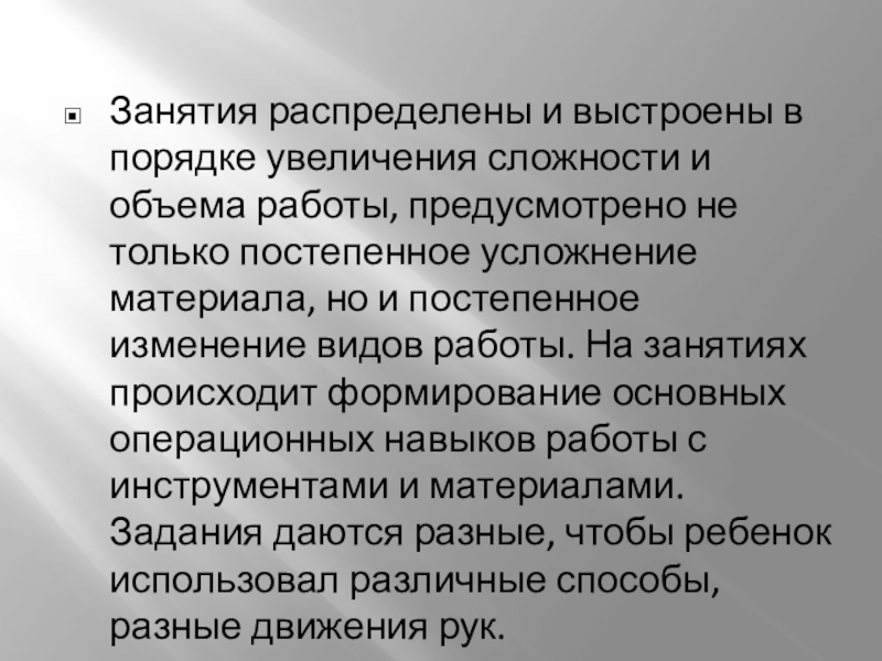 предусмотрено не только постепенное усложнение материала, но и постепенное изменение видов работы. На занятиях происходит формирование основных операционных навыков работы с инструментами и материалами. Задания даются разные, чтобы ребенок использовал различные способы, разные движения рук.