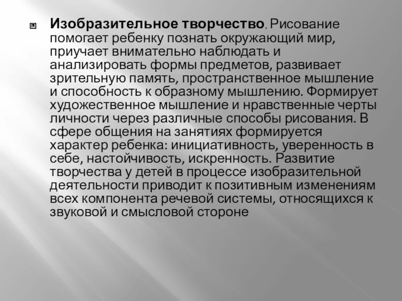 и анализировать формы предметов, развивает зрительную память, пространственное мышление и способность к образному мышлению. Формирует художественное мышление и нравственные черты личности через различные способы рисования. В сфере общения на занятиях формируется характер ребенка: инициативность, уверенность в себе, настойчивость, искренность. Развитие творчества у детей в процессе изобразительной деятельности приводит к позитивным изменениям всех компонента речевой системы, относящихся к звуковой и смысловой стороне