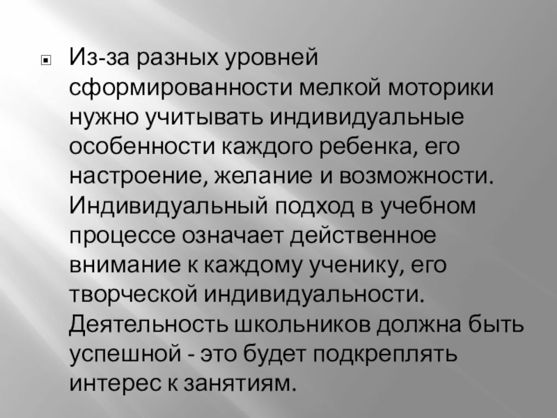Слайд 11Из-за разных уровней сформированности мелкой моторики нужно учитывать индивидуальные особенности каждого
