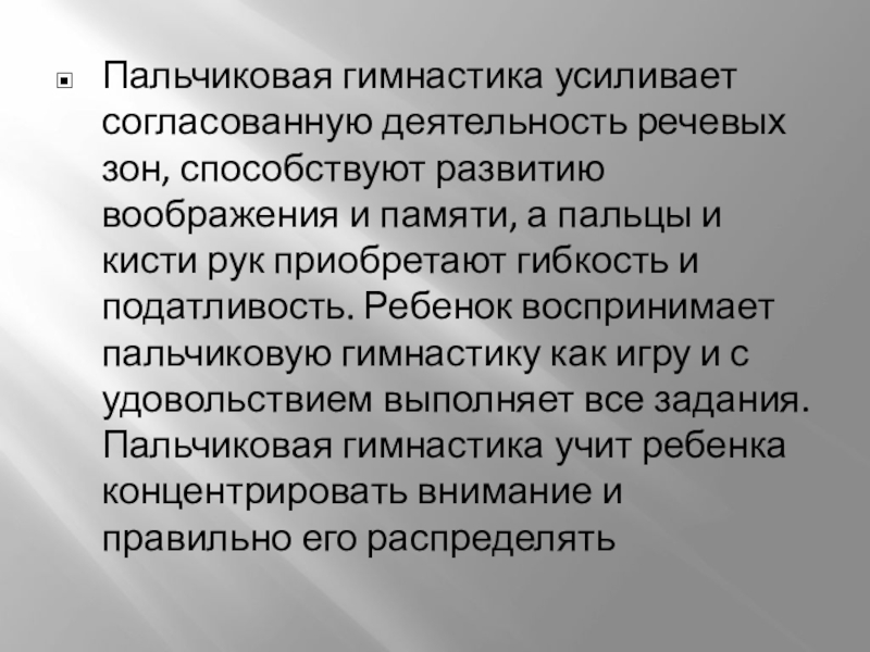 Слайд 12Пальчиковая гимнастика усиливает согласованную деятельность речевых зон, способствуют развитию воображения и