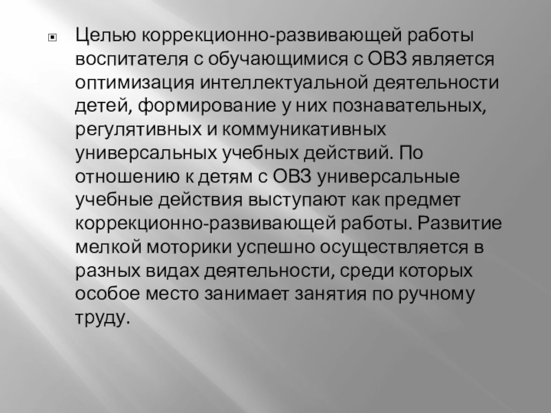 Слайд 8Целью коррекционно-развивающей работы воспитателя с обучающимися с ОВЗ является оптимизация интеллектуальной