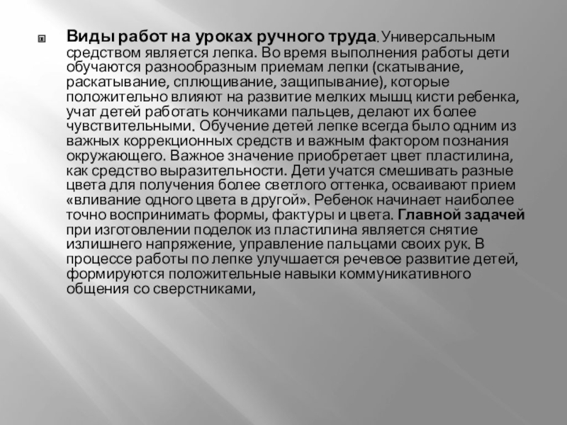 Слайд 13Виды работ на уроках ручного труда. Универсальным средством является лепка. Во