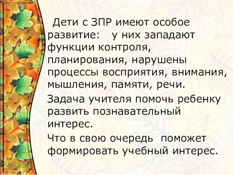 Дети с ЗПР имеют особое развитие: у них западают функции контроля, планирования, нарушены процессы восприятия, внимания, мышления, памяти, речи.
