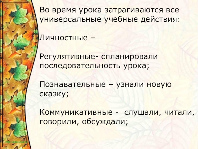 Слайд 17Во время урока затрагиваются все универсальные учебные действия: