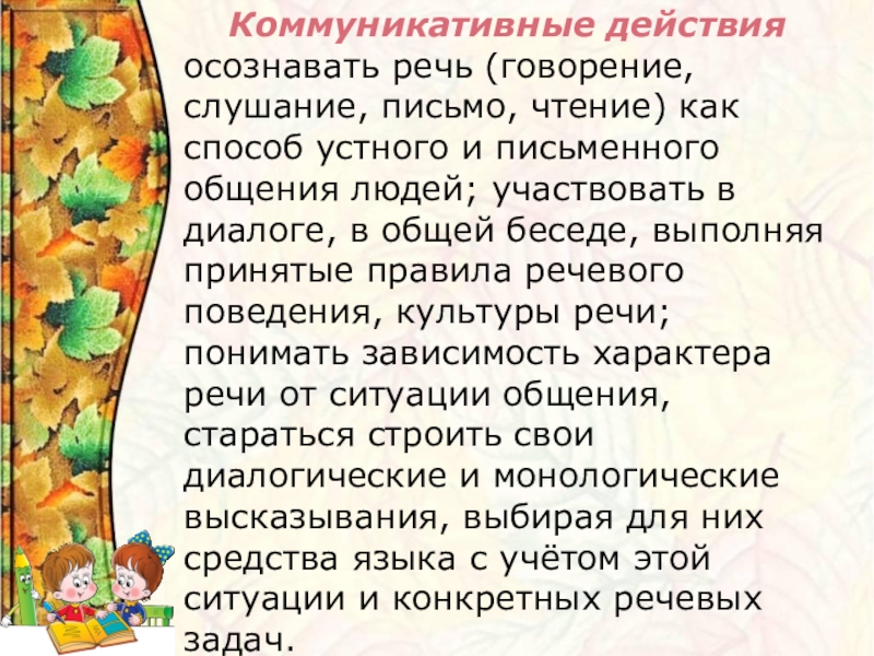 понимать зависимость характера речи от ситуации общения, стараться строить свои диалогические и монологические высказывания, выбирая для них средства языка с учётом этой ситуации и конкретных речевых задач.