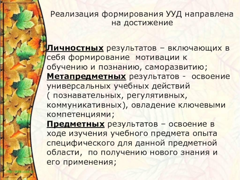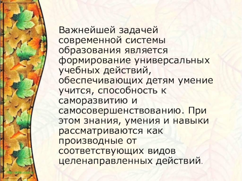 детям умение учится, способность к саморазвитию и самосовершенствованию. При этом знания, умения и навыки рассматриваются как производные от соответствующих видов целенаправленных действий.