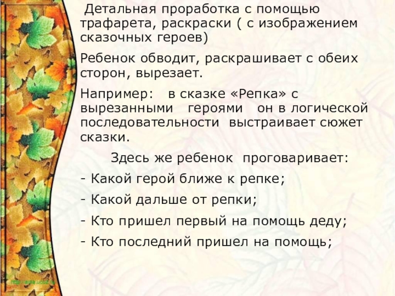 Например: в сказке «Репка» с вырезанными героями он в логической последовательности выстраивает сюжет сказки.