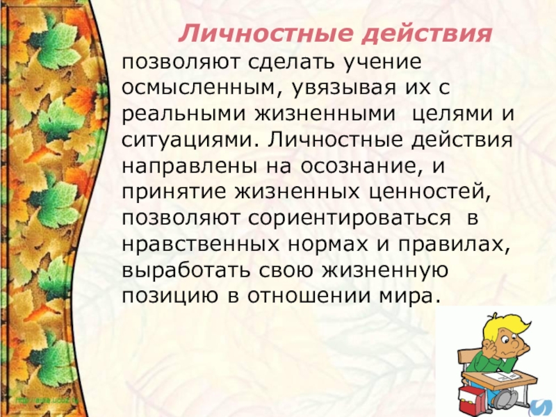 и ситуациями. Личностные действия направлены на осознание, и принятие жизненных ценностей, позволяют сориентироваться в нравственных нормах и правилах, выработать свою жизненную позицию в отношении мира.