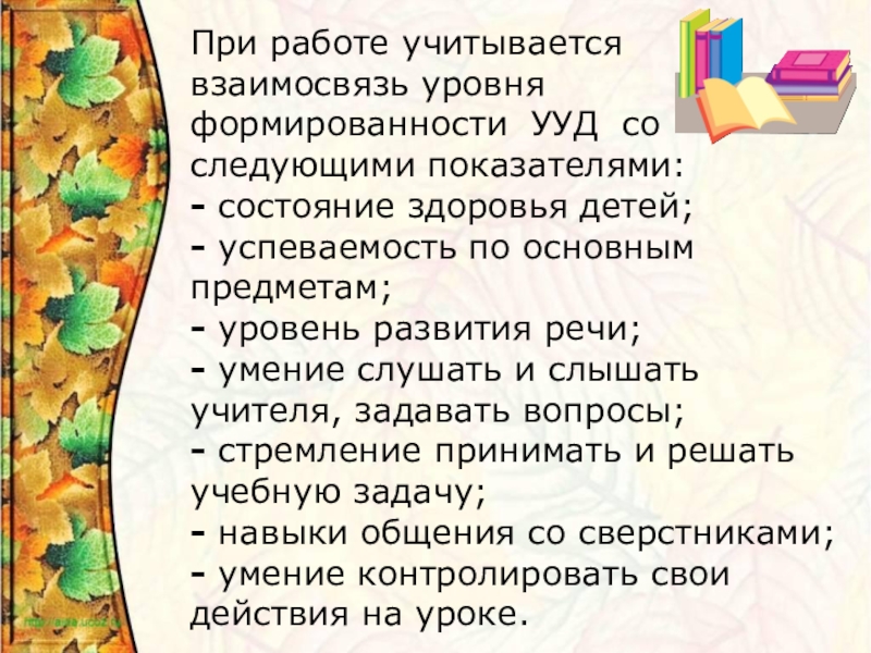 При работе учитывается взаимосвязь уровня формированности УУД со следующими показателями: