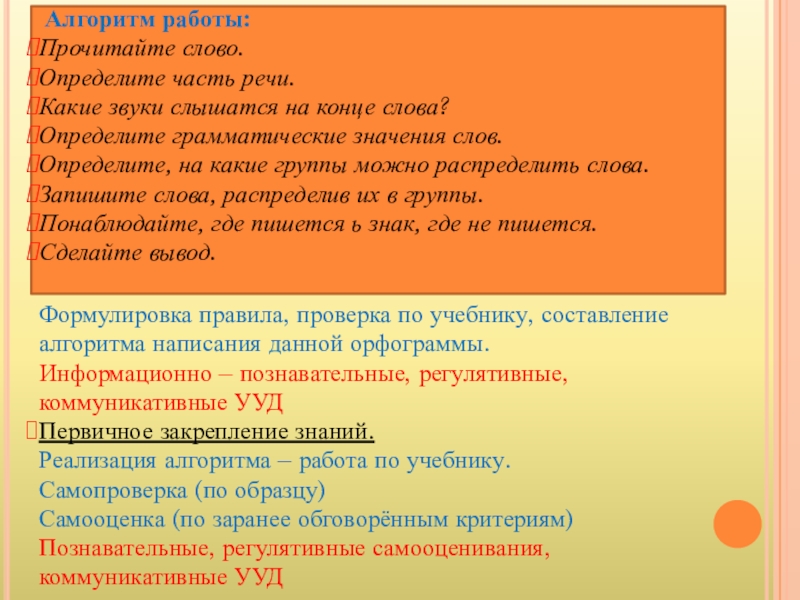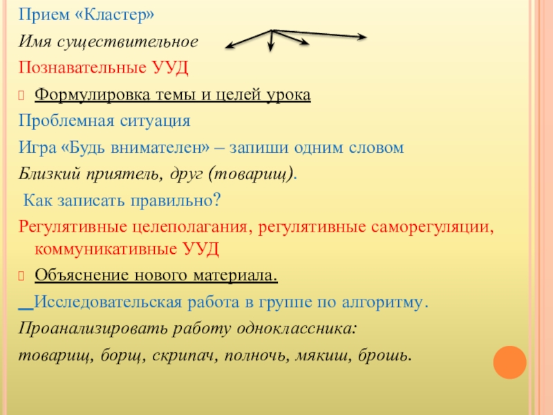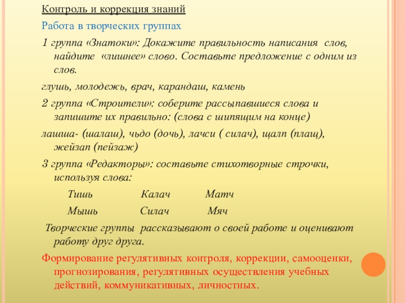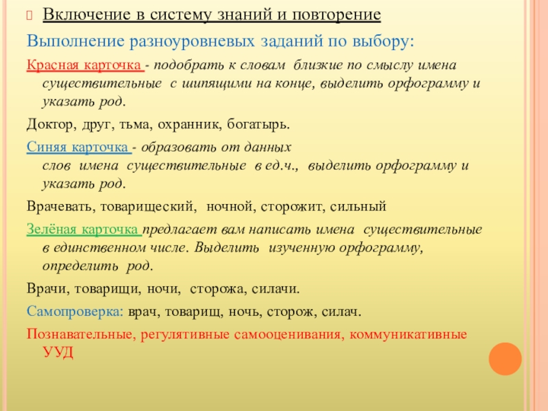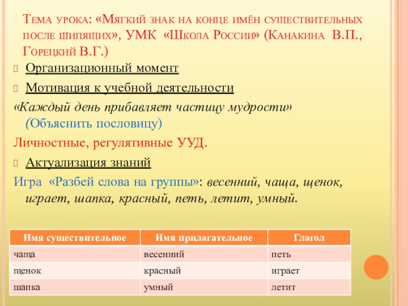 Игра «Разбей слова на группы»: весенний, чаща, щенок, играет, шапка, красный, петь, летит, умный.