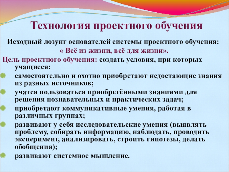 Цель проектного обучения: создать условия, при которых учащиеся: